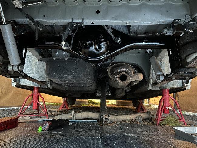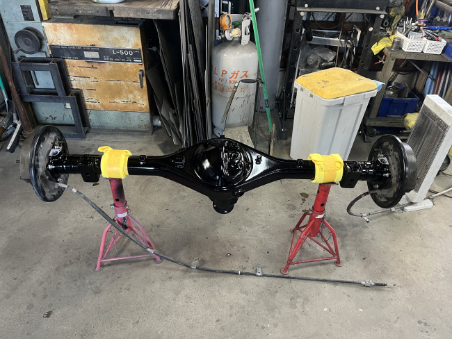 サードメンバー、アクスルシャフトの組み付けが完了したため、デフ一式を車体へ取り付けます😏