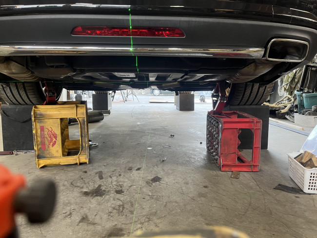 テールエンドの出幅や角度を最終確認しながら純正マフラーカッターを取り付け。リアビューの印象を左右するため、ここも妥協せず調整していきます👍