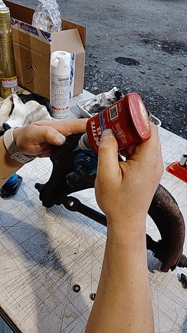アッパーボールジョイントのボルトにロックタイトを塗布。