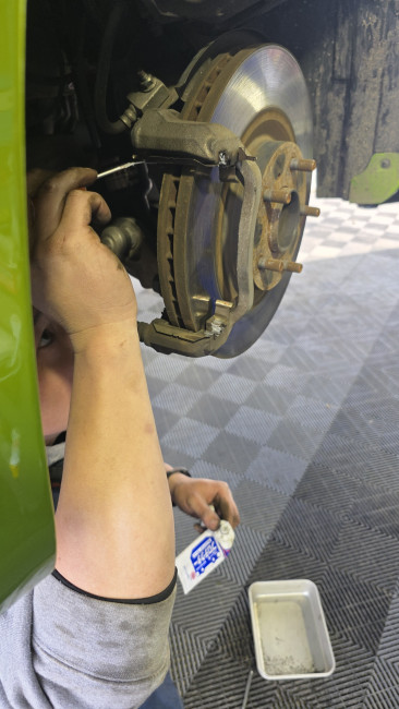 ブレーキパッド交換を行います!キャリパーの固定ボルトを緩め、キャリパーを上に持ち上げて古いブレーキパッドとシムを取り外しました🔧