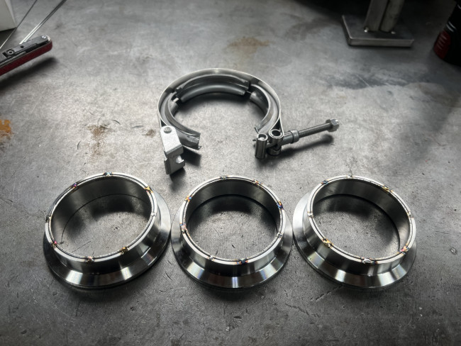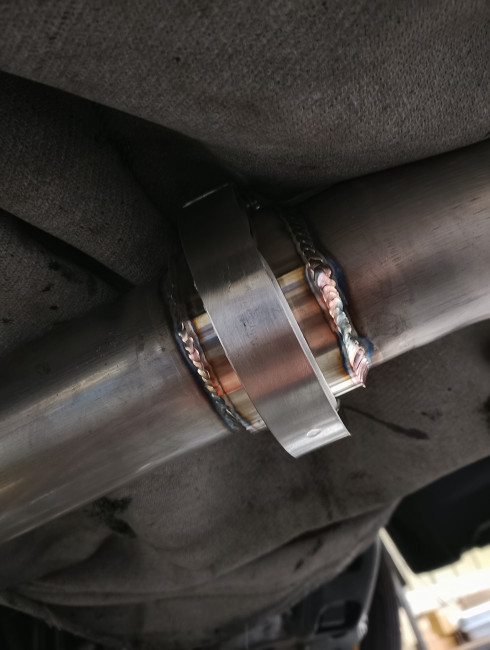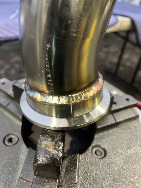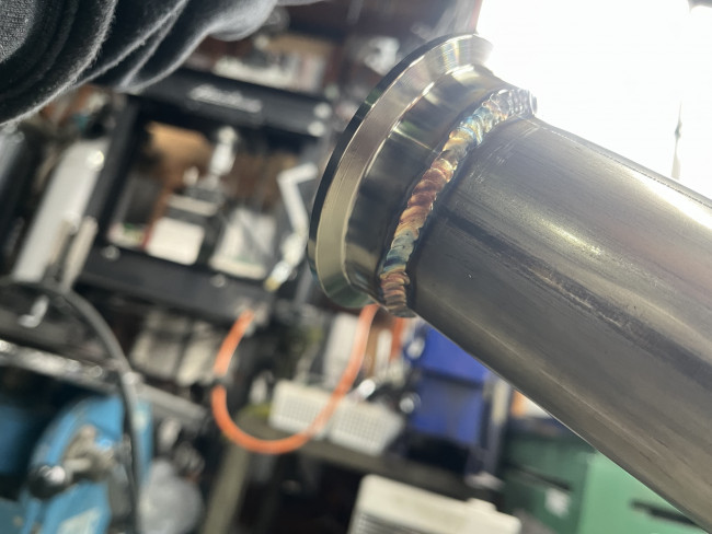 切断したフロント側にフランジを溶接しました🔥溶接時のズレや排気漏れを防ぐため、位置や角度を調整Σ(・ω・ノ)ノ!