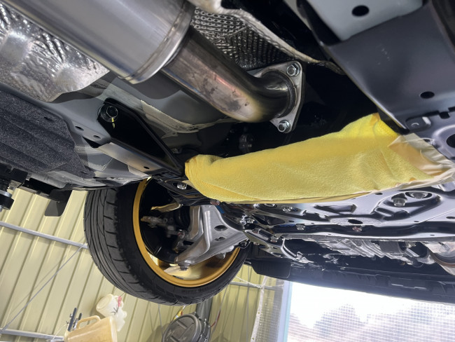 まずは純正マフラーを取り外し。周辺部品に干渉しないように慎重に行いました!