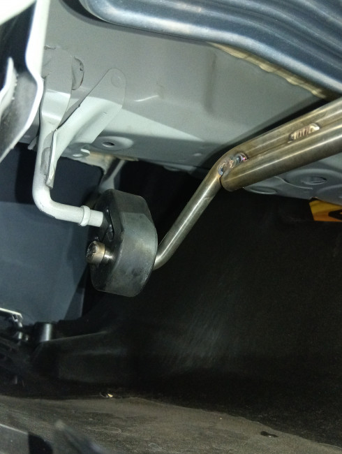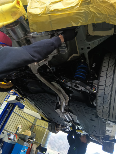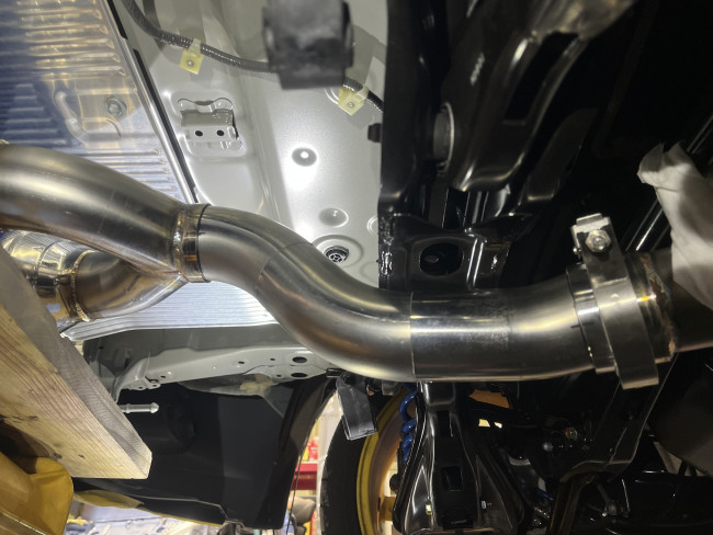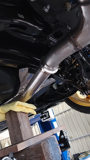 次に、純正マフラーフロント部を車載へ取り付け。